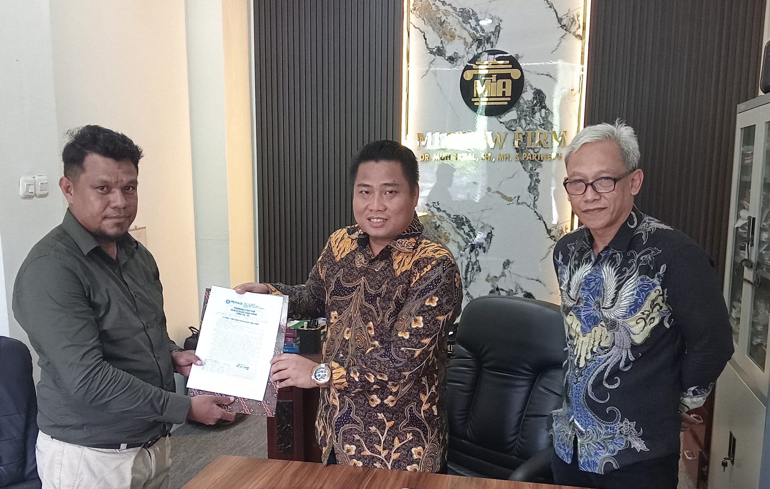 Ketua Panitia Muscab Peradi tahun 2026, DR Muhammad Ikbal SH MH menerima kelengkapan berkas calon ketua Peradi, Ibrahim Tane SH MH yang diserahkan oleh Tim Hukum, Raitno SH M.Kn. foto, ist