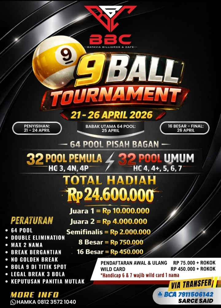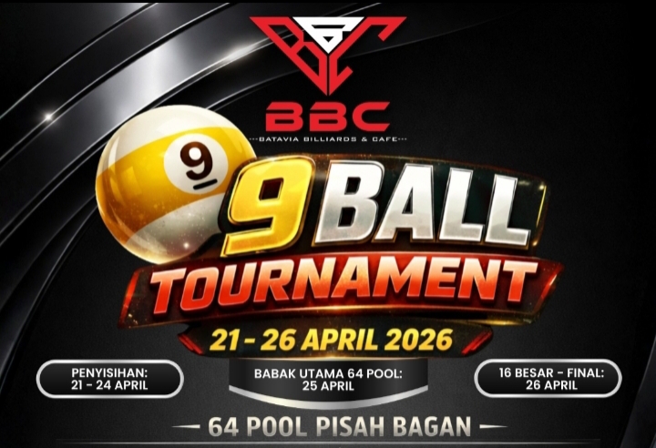 Turnamen Biliar BBC Nine Ball yang dilaksanakan sejak tanggal, 21 – 26 April 2026. Baik atlit pemula maupun atlit master berlomba-lomba untuk masuk di babak utama hingga ke babak semifinal dan partai final mendatang.