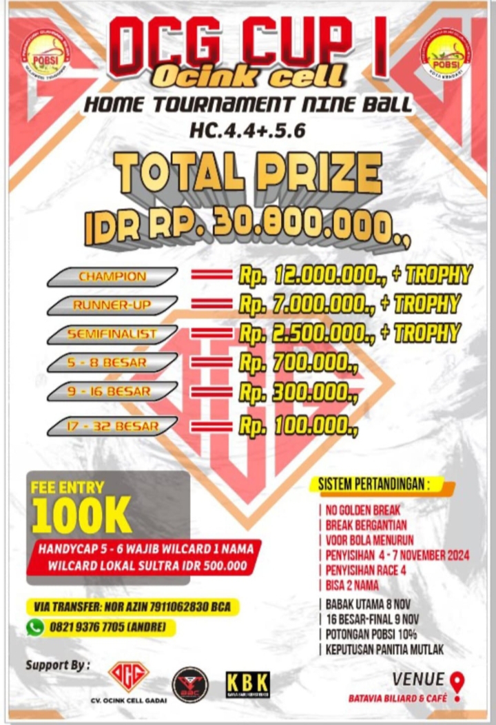 Sekadar informasi, Home Turnamen Nine Ball OCG Cup – I membuka babak kualifikasi penyisihan sebanyak 32 untuk juara pool dan sebanyak 32 untuk peserta melalui jalur wildcard sebanyak 32 hingga jumlah yang akan bertarung dibabak utama sejumlah 64 peserta dan atau atlit dari HC 4, HC 4+, HC 5 dan HC 6. (DEM/SO)